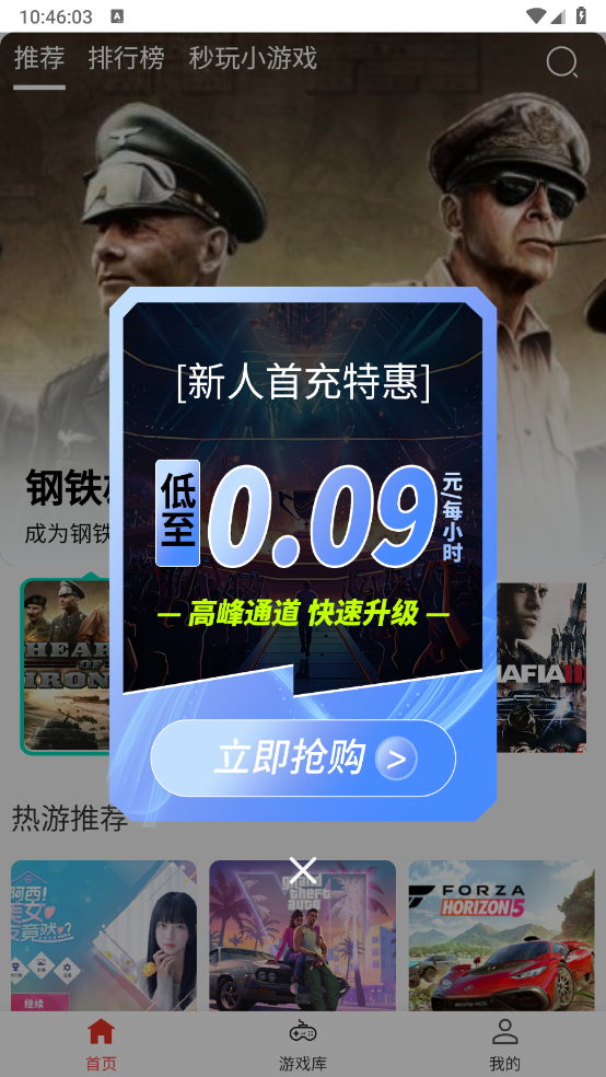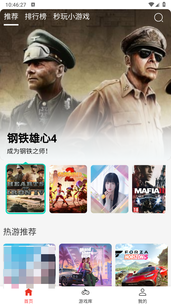 2.进入首页涵盖多个推荐的游戏、排行榜、和小游戏。