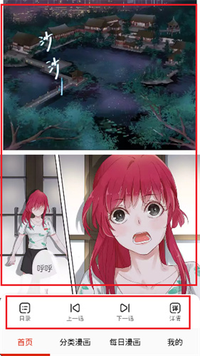 5、点击作品封面可直接进入到正文界面,如图所示,然后下方是常用的功能按钮,包括目录,上一话,下一话,详情,而且阅读界面非常的清爽简洁。