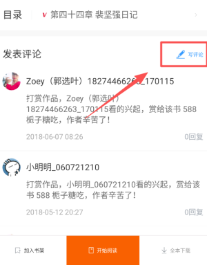 4.点目录第四十四章裴坚强日记,看评论区用户打赏,点加入书架等按钮,右上角可写评论。