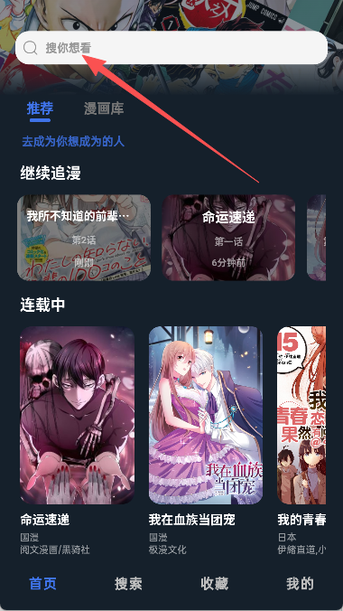 1、打开HoleFly漫画版,在软件首页上方找到并点击搜索框。