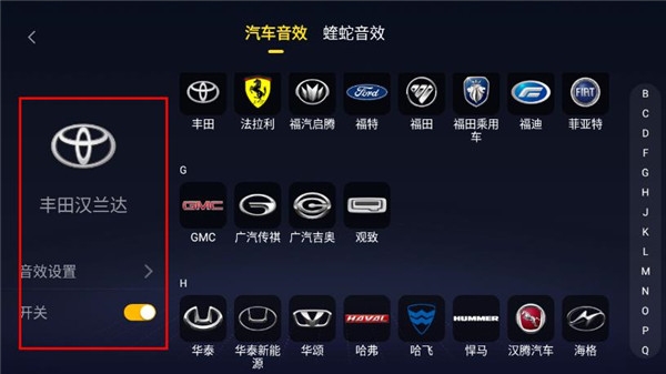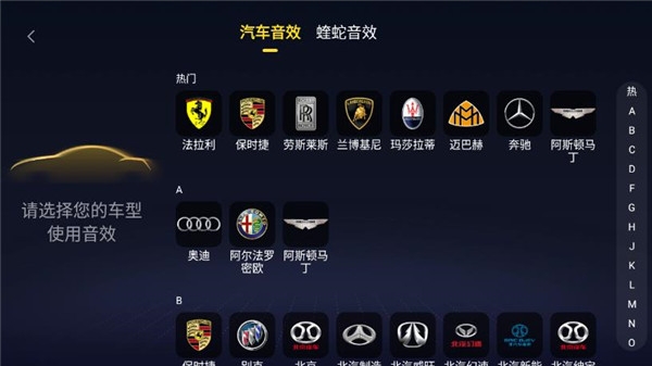 2、进入音效设置页面后,选择您的具体车型,系统将自动适配最优音效方案。